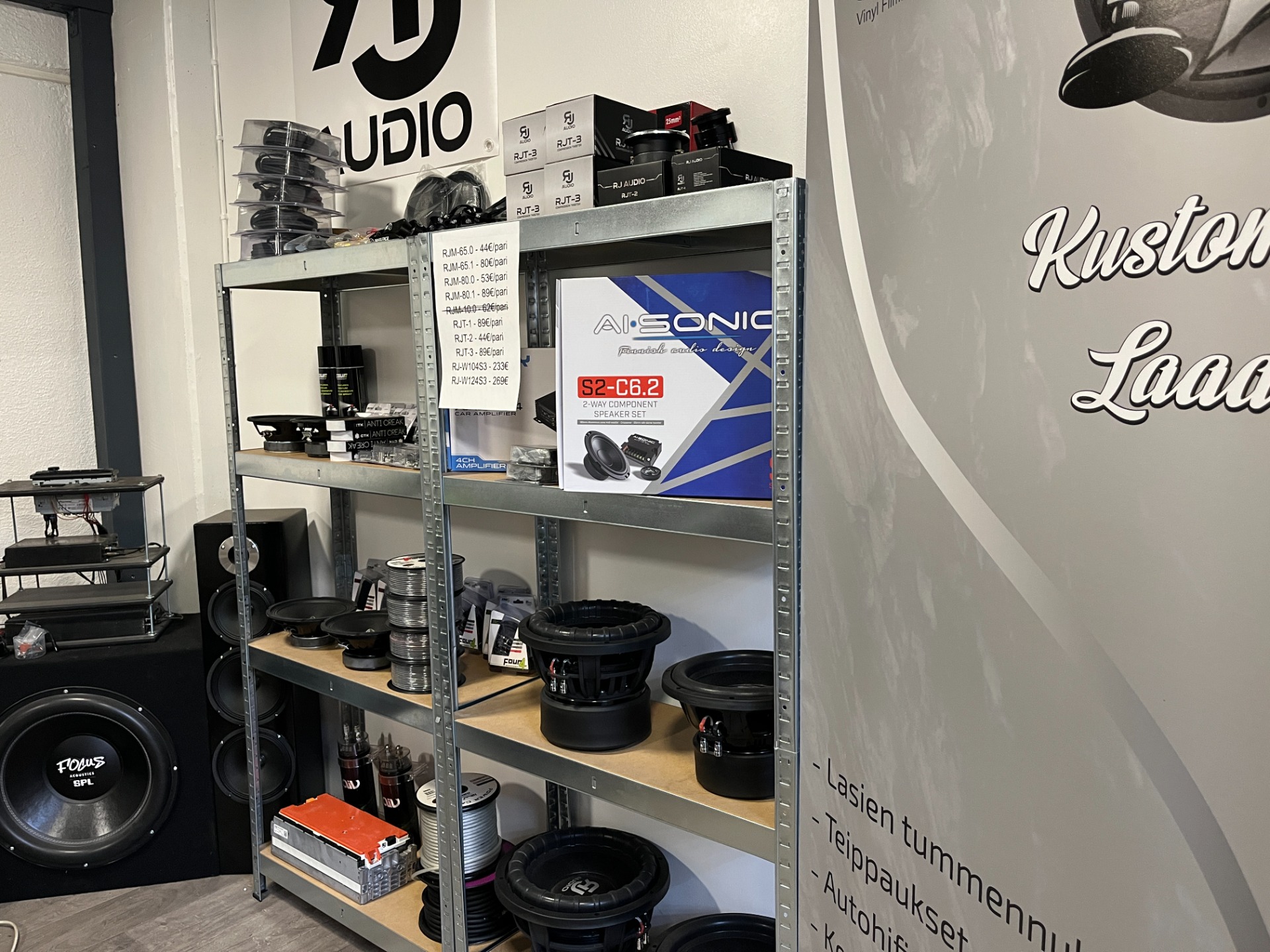 Pidämme varastossa pienen määrän kaiuttimia, vahvistimia ja asennustarvikkeita (sulakkeet, piuhat, liittimet yms).